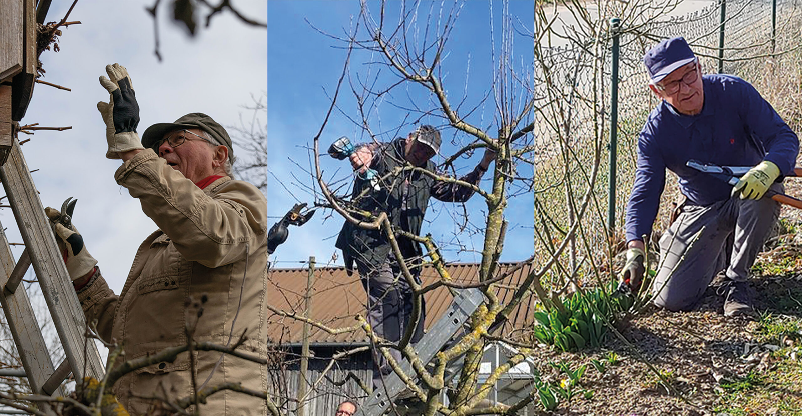 Bildunterschrift: Die Gartenpfleger des Obst- und Gartenbauvereins Pfaffenhofen gestalteten fachmännisch wieder die Schnittkurse. Links: Klaus Mächler beim deutlichen Rücknitt der Weinreben auf einen Zapfen mit zwei Augen. Mitte: Konrad Bayerl reduziert kräftig die Baumkrone für einen pyramidalen Aufbau. Viktor Bahr kniet gerne vor der Königin der Blumen nieder und prüft so deren Vitalität.