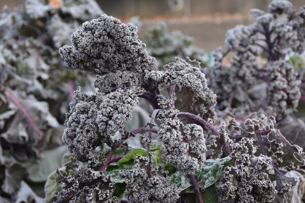 Grünkohl und Rosenkohl sind typische Wintergemüse, deren Ernte in der kalten Jahreszeit liegt. Sie vertragen oft Temperaturen bis zu minus zehn Grad Celsius. Während alte Rosenkohlsorten Frost benötigen, damit die Röschen nicht bitter schmecken, brauchen neuere Sorten nicht zwingend die Einwirkung von Frost. Durch Kälteeinwirkung werden sie jedoch schmackhafter und milder, da der Zuckergehalt in den Röschen steigt. Grünkohl ist mit seinen gekrausten Blättern zudem eine Augenweide im winterlichen Garten. Bei beiden Kohlarten gibt es außer den grünen auch rot-lila Sorten, die besonders attraktiv sind. Beim Kochen bleibt die intensive Farbe leider nicht erhalten.